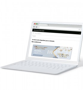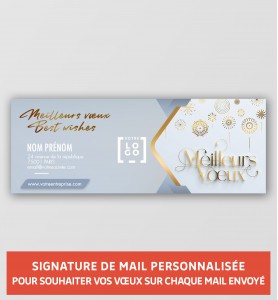 À partir de 185,00 € HTUne signature de mail graphique personnalisée et animée pour rayonner ! Pour apporter une touche de simplicité à vos vœux dans chaque email, remplacez ou complétez temporairement votre signature de mail habituelle par notre signature graphique . Entièrement personnalisable avec votre logo , vos coordonnées , votre nom et votre fonction, cette signature mail sobre et élégante mettra en valeur votre professionnalisme . Faites preuve de simplicité et d'élégance en utilisant cette signature mail pour souhaiter vos vœux à chaque envoi. Pour booster votre communication de fin d’année, nous vous proposons nos offres de packs numériques (ecard + signature mail + éventuellement posts RS) plus efficaces pour toucher tous vos contacts et ...plus avantageuses ! NOUVEAU ET IMPORTANT POUR TOUS VOS ENVOIS DE MAILS ET NEWSLETTER ! Nous vous proposons de nettoyer et de tester entièrement votre fichier d'adresses mail et de vous le restituer clean avant l'envoi de vos campagnes de voeux par ecards ... enfin un fichier de contacts mails sans problème ! Contactez notre service au 04 42 16 38 92. -