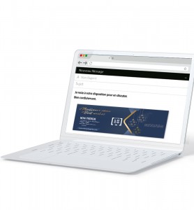 Choisissez une signature de mail (animée en GIF au format 600 x 222 px.), une manière moderne pour souhaiter vos vœux à chaque envoi de mail. La signature mail sera personnalisée directement en ligne (vous ajoutez en 5 minutes votre logo, vos coordonnées, lien web, etc.) Les signatures mails animées de fin d'année sont un complément efficace, moderne et économique pour renforcer l'impact de votre campagne de cartes de voeux internet. Nous vous adressons sous 48 heures le fichier à insérer directement et facilement dans votre messagerie.