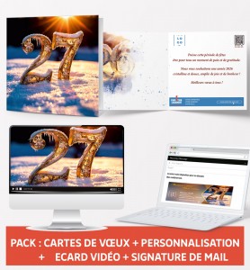 À partir de 0,00 € HTLes cartes de voeux de Noël ne sont plus ringardes ! la preuve en vidéo ! Voici notre carte de vœux éléctronique entreprise chic, élégante, tendance et recherchée pour 2026 ! Près de 50 modèles d'ecards pour entreprises, associations, collectivités et administrations vous attendent sur notre site. Pour booster votre communication de fin d’année, nous vous proposons nos offres de packs numériques (ecard + signature mail + éventuellement posts RS) plus efficaces pour toucher tous vos contacts et ...plus avantageuses ! NOUVEAU ET IMPORTANT POUR TOUS VOS ENVOIS DE MAILS ET NEWSLETTERS ! Nous vous proposons de nettoyer et de tester entièrement votre fichier d'adresses mail et de vous le restituer clean avant l'envoi de vos campagnes de voeux par ecards ... enfin un fichier de contacts mails sans problème ! Contactez notre service au 04 42 16 38 92. Pour votre ecard vidéo, n'augmentez pas la quantité. Une seule suffit ! Si vous souhaitez commander plusieurs ecards (une par service ou par collaborateur, par exemple), appelez-nous au 04 42 16 38 92. -