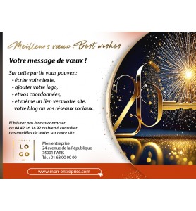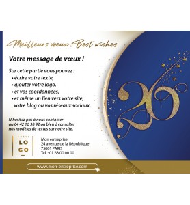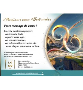 À partir de 189,00 € HTVotre carte de vœux 2026 électronique " le lien " à envoyer simplement par mail ! Personnalisez vous-même cette carte de vœux électronique sur le thème de l' avenir avec votre logo , votre texte et un lien vers votre site internet et envoyez-la tout simplement par mail . Cette carte virtuelle fixe sur le thème d'une année chaleureuse . Ré-expédiez le mail reçu à tous les contacts de votre carnet d'adresses pour qu'ils reçoivent votre superbe message d' avenir ensoleillé dans leurs mails. Faites briller votre entreprise avec cette carte de vœux numérique personnalisée et modernisez votre communication pour l'année à venir. Profitez de cette occasion pour renforcer vos liens professionnels et transmettre une image positive et tournée vers l' avenir . Envoyez simplement vos vœux par mail à tous vos contacts. Pour booster votre communication de fin d’année, nous vous proposons nos offres de packs numériques (ecard + signature mail + éventuellement posts RS) plus efficaces pour toucher tous vos contacts et ...plus avantageuses ! NOUVEAU ET IMPORTANT POUR TOUS VOS ENVOIS DE MAILS ET NEWSLETTERS ! Nous vous proposons de nettoyer et de tester entièrement votre fichier d'adresses mail et de vous le restituer clean avant l'envoi de vos campagnes de voeux par ecards ... enfin un fichier de contacts mails sans problème ! Contactez notre service au 04 42 16 38 92. -