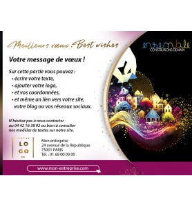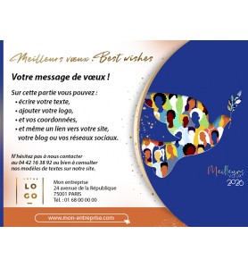À partir de 189,00 € HTVotre carte de vœux virtuelle sur le thème de la paix, la fraternité ! Personnalisez vous-même cette carte de vœux électronique sur le thème de la paix , la liberté, la fraternit é avec votre logo, votre texte et même un lien vers votre site internet et envoyez-la tout simplement par mail. Cette ecard pleine de poésie est très simple ; ré-expédiez le mail reçu à tous les contacts de votre carnet d'adresses pour qu'ils reçoivent votre message de vœux dans le corps du mail. Célébrons ensemble ces valeurs universelles et partageons un message d'espoir et de solidarité en cette nouvelle année. Que la paix, la liberté et la fraternité guident nos actions et rapprochent les cœurs. Joyeuses fêtes à tous ! Envoyez simplement vos vœux par mail à tous vos contacts. -