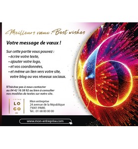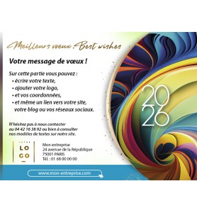 À partir de 189,00 € HTFaites éclater les couleurs 2026 en envoyant votre carte de vœux électronique ! Maximisez votre impact en associant votre carte de vœux sur le thème d'une explosion de couleur à une ecard fixe mettant en avant cette image aux pigments colorés à envoyer par mail à tous vos clients. En choisissant cette combinaison, vous toucherez un large public et transmettrez votre message de manière percutante . Laissez cette ecard captiver l'attention de vos destinataires et refléter votre image dynamique et innovante . Exprimez vos vœux sincères pour une année exceptionnelle, remplie de réussite et de bonheur. Ne manquez pas cette opportunité de faire sensation et de renforcer votre relation avec vos clients grâce à cette approche originale . Envoyez simplement vos vœux par mail à tous vos contacts. -