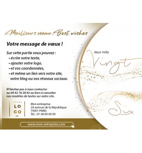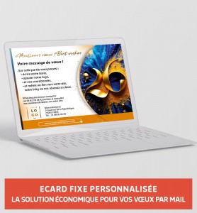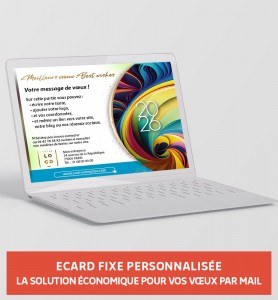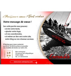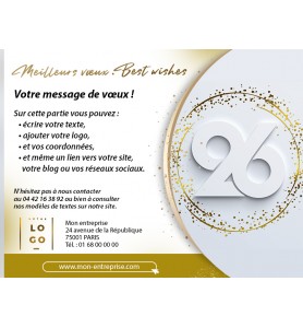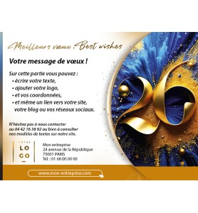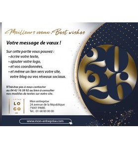 À partir de 189,00 € HTSimplifiez l'envoi de vos vœux avec cette carte électronique 2026 ! Faites preuve de créativité en personnalisant vous-même cette carte de vœux électronique sur le thème de la nouvelle année. Ajoutez votre logo, votre texte et un lien vers votre site internet pour une touche personnalisée . Une fois personnalisée, envoyez simplement cette ecard calendrier par mail. Pour que vos contacts reçoivent votre message de vœux directement dans le corps du mail, il vous suffit de ré-expédier votre mail à tous les contacts de votre carnet d'adresses. Une manière pratique et efficace de transmettre vos vœux pour la nouvelle année de manière originale et personnalisée. Envoyez simplement vos vœux par mail à tous vos contacts. Pour booster votre communication de fin d’année, nous vous proposons nos offres de packs numériques (ecard + signature mail + éventuellement posts RS) plus efficaces pour toucher tous vos contacts et ...plus avantageuses ! NOUVEAU ET IMPORTANT POUR TOUS VOS ENVOIS DE MAILS ET NEWSLETTERS ! Nous vous proposons de nettoyer et de tester entièrement votre fichier d'adresses mail et de vous le restituer clean avant l'envoi de vos campagnes de voeux par ecards ... enfin un fichier de contacts mails sans problème ! Contactez notre service au 04 42 16 38 92. -