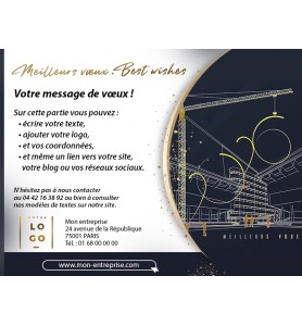 À partir de 189,00 € HTVotre carte de vœux électronique sur les métiers de l'immobilier à adresser par mail ! Offrez vos vœux les plus chaleureux pour l'année 2026 aux entrepreneurs du bâtiment , promoteurs, constructeurs, architectes, conseils, entreprises de l ’immobilier , bureaux d’études et techniques avec notre ecard fixe aux couleurs éclatantes . Le message de continuer à bâtir ensemble renforcera vos relations professionnelles. Envoyez simplement vos vœux par mail à tous vos contacts. Pour booster votre communication de fin d’année, nous vous proposons nos offres de packs numériques (ecard + signature mail + éventuellement posts RS) plus efficaces pour toucher tous vos contacts et ...plus avantageuses ! NOUVEAU ET IMPORTANT POUR TOUS VOS ENVOIS DE MAILS ET NEWSLETTERS ! Nous vous proposons de nettoyer et de tester entièrement votre fichier d'adresses mail et de vous le restituer clean avant l'envoi de vos campagnes de voeux par ecards ... enfin un fichier de contacts mails sans problème ! Contactez notre service au 04 42 16 38 92. -