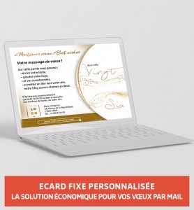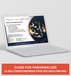 À partir de 189,00 € HTVotre carte de vœux électronique haut de gamme originale et graphique ! Amplifiez la portée de votre communication de fin d'année en fusionnant votre carte de vœux papier millésimée avec une eCard fixe . Cette eCard est élégante et très chic. Partagez ce visuel par mail avec vos clients, étendant ainsi vos vœux à tous les horizons. Envoyez simplement vos vœux par mail à tous vos contacts.