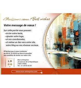À partir de 189,00 € HTVotre carte de vœux électronique pour des vœux design et artistiques à envoyer par mail ! Envoyez des vœux uniques cette année en personnalisant cette carte de vœux électronique sur le thème Street Art . Ajoutez votre logo, votre texte personnalisé et même un lien vers votre site internet pour une présentation professionnelle. Laissez-vous inspirer par l' abstraction colorée de cette ecard et partagez votre message de vœux avec style . Une fois votre personnalisation terminée, il vous suffit de ré-expédier le mail à tous les contacts de votre carnet d'adresses pour qu'ils découvrent votre message de vœux dans le corps du mail. Optez pour une approche moderne et artistique pour transmettre vos vœux cette année. Envoyez simplement vos vœux par mail à tous vos contacts. -