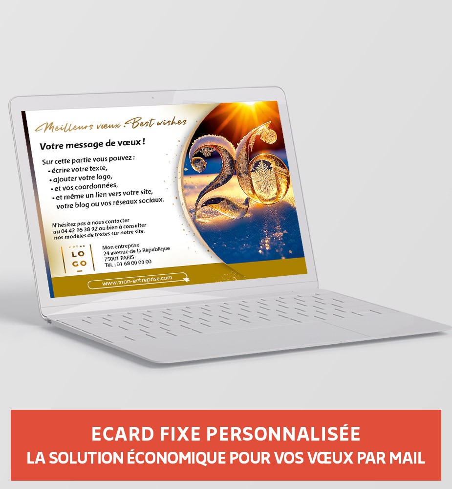 Faites le choix du raffinement pour envoyer vos vœux à un large public en ce début d'année avec cette ecard assortie à votre carte de vœux millésimée. Ses couleurs chaleureuses sauront séduire chacun de vos destinataires. Personnalisez cette ecard fixe de vœux professionnelle en y ajoutant un message personnalisé. Son design cristallin, sublimé par un flocon de neige, ajoutera une touche de féérie à vos vœux. Partagez vos vœux avec élégance et originalité grâce à cette ecard de Noël qui saura captiver tous ceux qui la recevront.