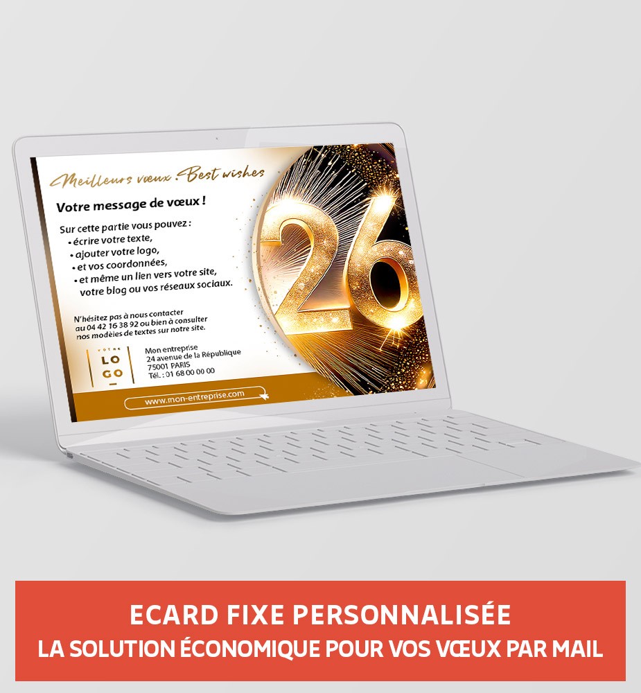 Simplifiez l'envoi de vos vœux en ce début d'année avec cette ecard assortie à votre carte de vœux papier. Optez pour la sérénité en envoyant ce message personnalisable par mail à un grand nombre de personnes. Cette ecard de vœux professionnelle et luxueuse sera appréciée par tous vos clients et collaborateurs. Faites le choix de la praticité et de l'efficacité pour transmettre vos vœux de manière professionnelle et personnalisée, tout en créant une atmosphère chaleureuse et festive.