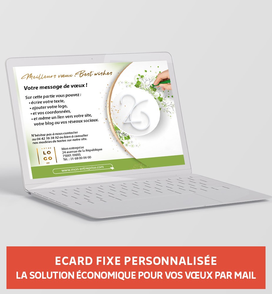 Étendez votre impact en associant votre carte de vœux à un thème festif avec une ecard fixe. Envoyez-la par mail à tous vos clients et répandez la magie des célébrations. Faites briller vos vœux et créez des souvenirs inoubliables.