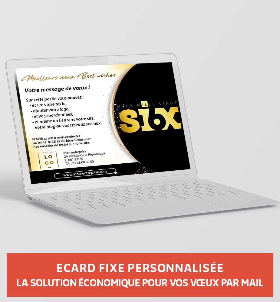 Amplifiez la portée de votre communication de fin d'année en fusionnant votre carte de vœux papier millésimée avec une eCard fixe. Cette eCard est élégante et très chic. Partagez ce visuel par mail avec vos clients, étendant ainsi vos vœux à tous les horizons.
