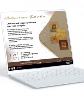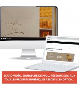 Tous nos modèles de cartes de vœu en papier sont déclinés en versions électroniques assorties : ecard de vœux vidéo, ecard professionnelle animée en GIF à insérer dans vos mails, signatures mail entreprise et posts pour vos réseaux sociaux et votre site web.