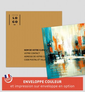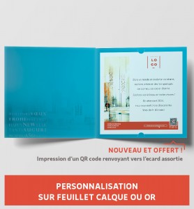 La créatrice de ce modèle de carte de vœux vous recommande le feuillet calque avec une couleur d’impression contrastée avec le bleu de l’intérieur de la carte. Très chic pour sublimer cette carte de vœux très expressive ! Elle vous recommande également d’opter pour une enveloppe or métallisé (en option), le rendu sera très élégant, parfait pour une carte de vœux professionnelle internationale.