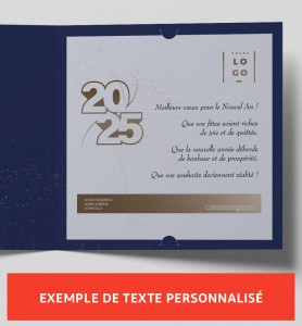 Lot de 25 cartes de vœux, feuillets doubles or et enveloppes compris. Vous recherchez une de carte de vœux entreprise 2026 élégante, design et rayonnante ? Cette carte de vœux graphique est faite pour vous ! Son graphisme très pur et raffiné , sublimé par les harmonieuses lignes courbes or et bleu électrique , saura séduire vos partenaires. Cette carte chic et élégante s'adresse à tous vos clients et partenaires. La tradition et le savoir-faire haut de gamme sont au cœur de cette création. Offrez une carte de vœux professionnelle qui témoigne de votre engagement envers l'excellence et laissez une impression durable auprès de vos partenaires. Associez ce modèle de carte de vœux design à l' enveloppe or métallisé (option) pour un rendu encore plus élégant et raffiné. Tous nos modèles de cartes de vœux 2026 en papier sont déclinés en versions électroniques assorties : ecard de vœux vidéo musicale, ecard professionnelle animée en GIF à insérer dans vos mails, signatures mail entreprise et posts pour vos réseaux sociaux et votre site web. Pour booster votre communication de fin d’année, nous vous proposons nos offres de packs numériques (ecard + signature mail + éventuellement posts RS) plus efficaces pour toucher tous vos contacts et ...plus avantageuses ! NOUVEAU ET IMPORTANT POUR TOUS VOS ENVOIS DE MAILS ! Nous vous proposons de nettoyer et de tester entièrement votre fichier d'adresses mail et de vous le restituer clean avant l'envoi de vos campagnes de voeux par ecards ... enfin un fichier de contacts mails sans problème ! Contactez notre service au 04 42 16 38 92. Toutes nos cartes sont conçues et fabriquées en France ! -