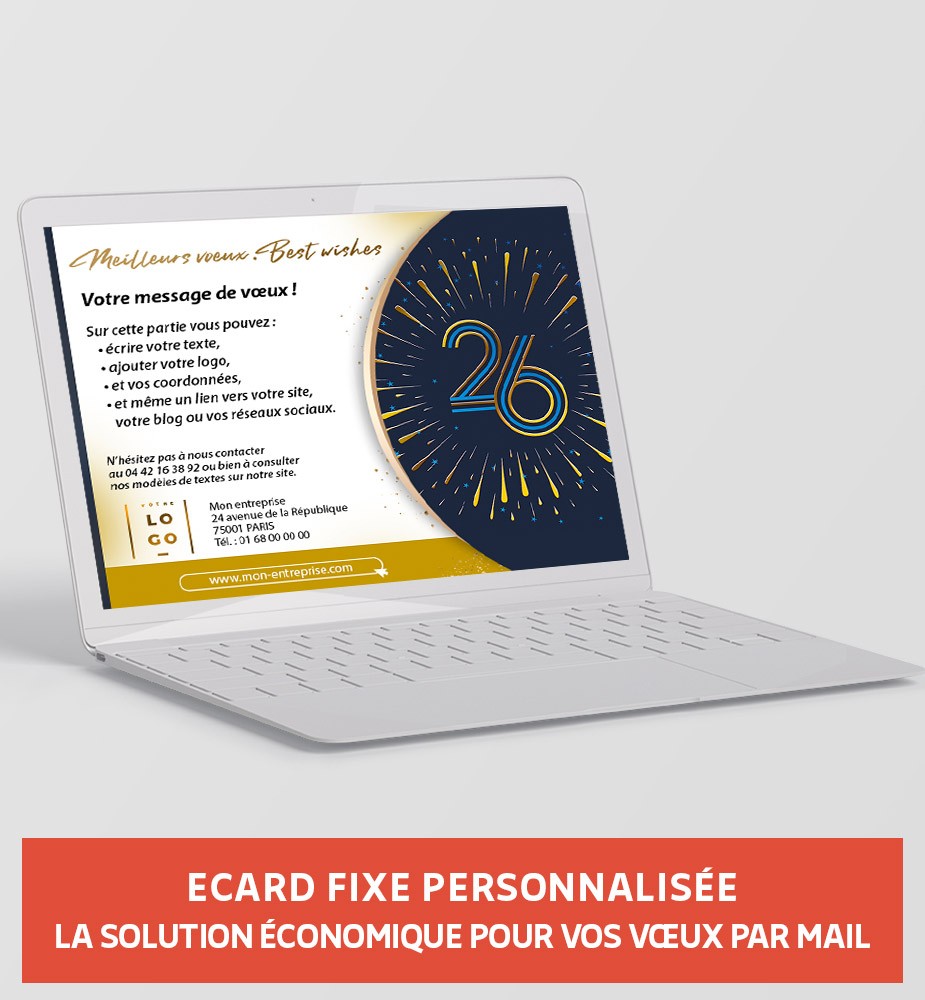 Accroissez votre visibilité en associant votre carte de vœux millésimée à une eCard fixe. Cette eCarte met en avant une image aux couleurs bleues et dorées, évoquant l'élégance et la sophistication. Envoyez ce visuel par mail à vos clients, étendant ainsi vos vœux à un large auditoire.