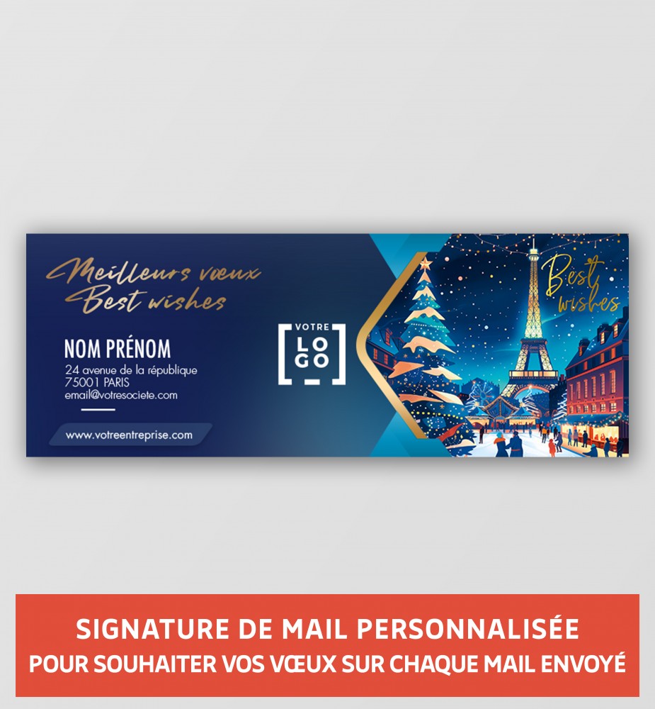 Pour une signature de mail mémorable, offrez la magie de Noël à Paris à vos clients quand vous leur écrivez et faites preuve d'originalité ! Soyez exceptionnel en ajoutant une signature mail personnalisée. Utilisez des visuels saisissants et un message percutant pour captiverl'attention de vos destinataires et créer un impact durable. Ne passez pas inaperçu, laissez votre signature mail faire parler d'elle.