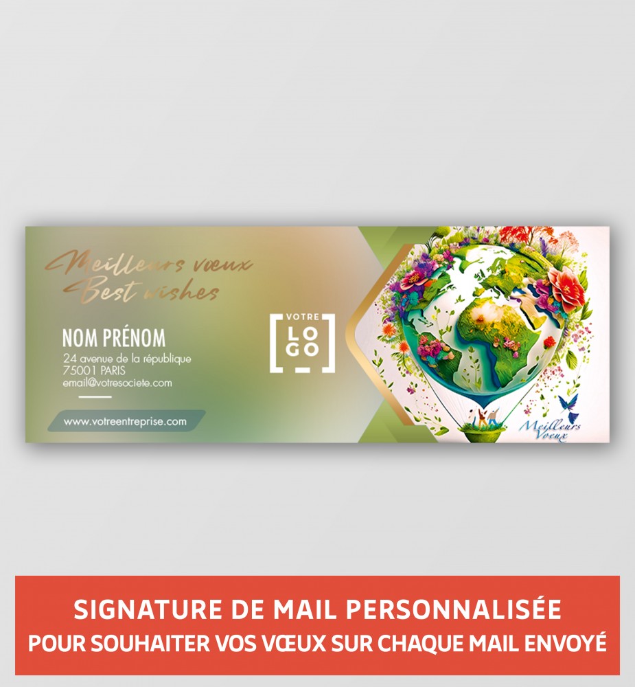 Optez pour une signature mail au visuel délicat, représenté par nos précieuses ressources naturelles. Exprimez votre soutien à l'environnement en choisissant une signature mail qui reflète vos valeurs. Avec son design raffiné et écoresponsable, elle témoigne de votre engagement pour la préservation de notre planète. Chaque envoi devient ainsi une occasion de sensibiliser et d'inspirer, tout en laissant une impression positive sur vos destinataires. Choisissez une signature mail qui parle pour vous et votre engagement envers un avenir durable.